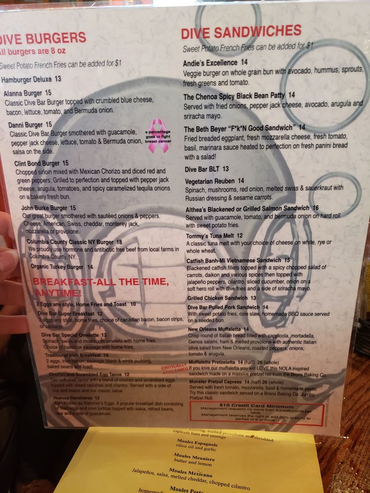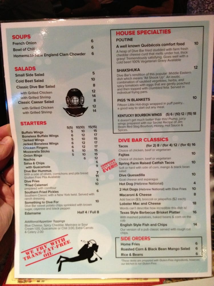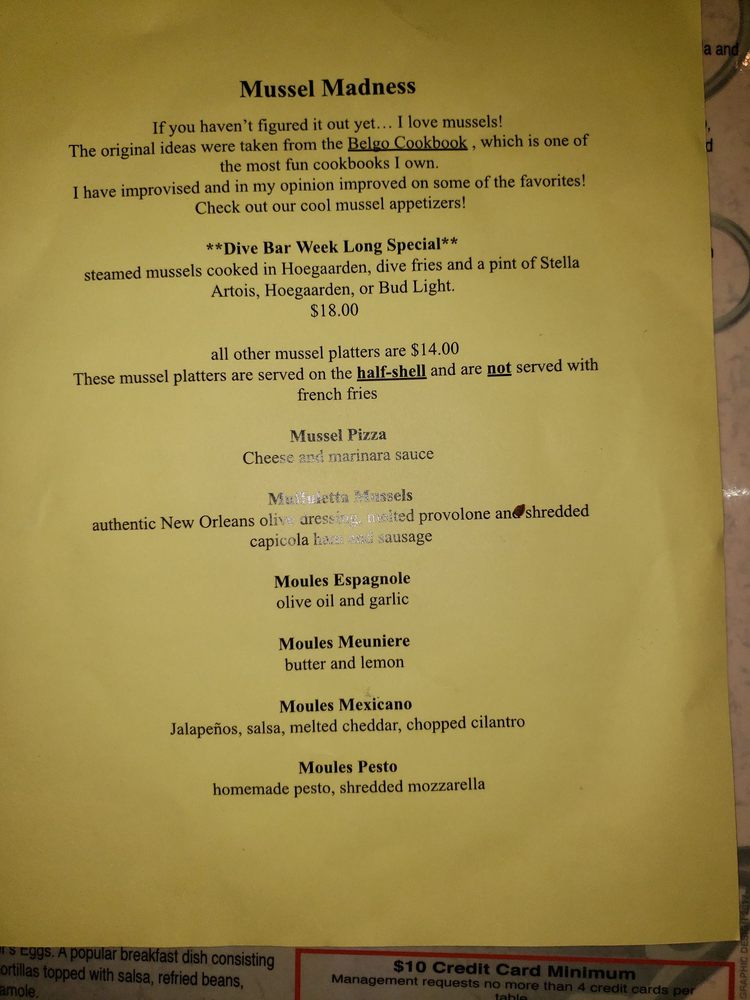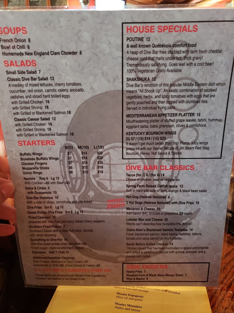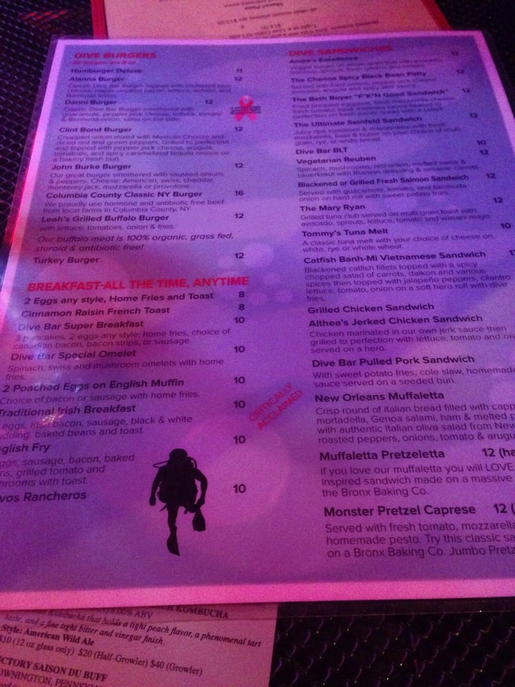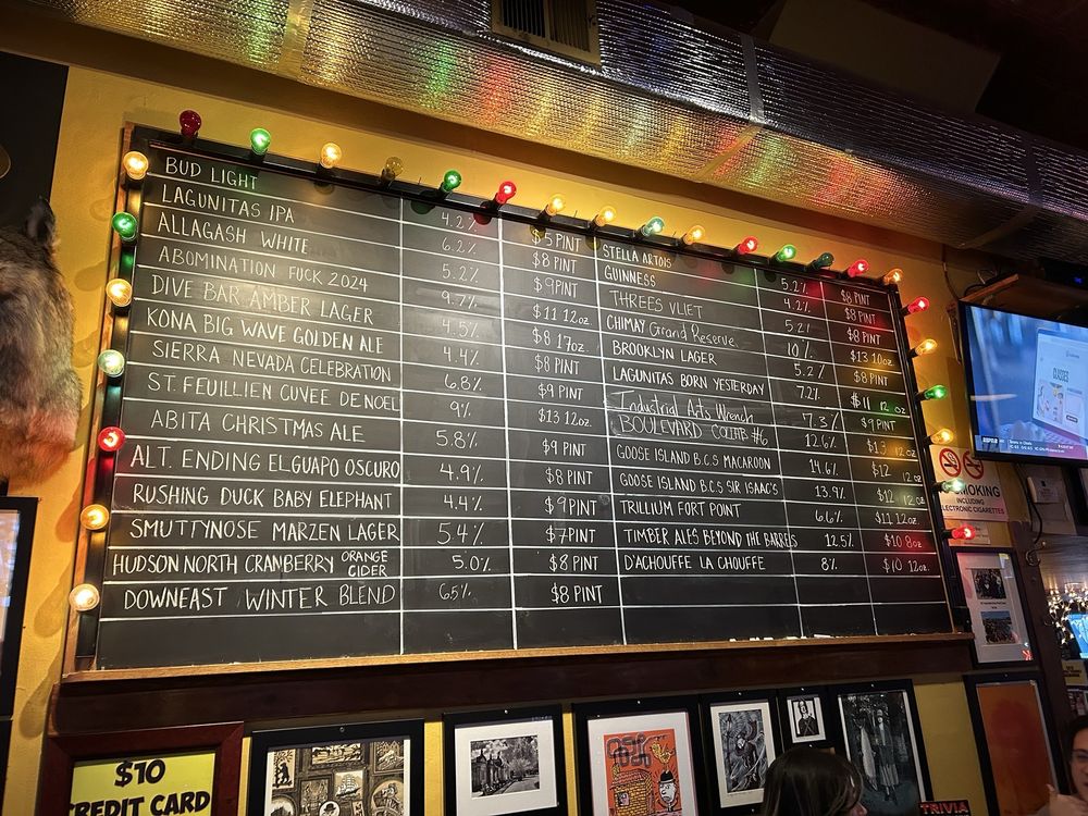 Introducing Dive Bar, located in New York City, this American-style restaurant offers a divey atmosphere with a full bar, pool table, and jukebox. Serving up classic American dishes like Boneless Buffalo Wings, Chili, and a variety of salads, Dive Bar is the go-to spot for a casual night out with friends. The menu also features happy hour specials and a 2024 Special, complete with Buffalo wings and Stella Artois. Customers rave about the extensive beer selection, friendly service, and cozy ambiance. Whether you're looking for a place to watch the game, enjoy a burger special, or simply relax with a drink, Dive Bar has you covered. Don't miss out on their trivia nights and rotating beer menu. Dive into the laid-back vibes at Dive Bar for a truly authentic dive bar experience.